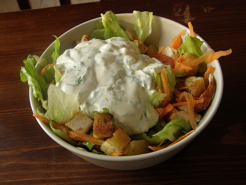 8. Pierś z kurczaka pokrój w kostkę, dodaj do sałaty, wymieszaj, wrzuć grzanki czosnkowe. Sałatka McDonalds polej sosem jogurtowo-koperkowym.